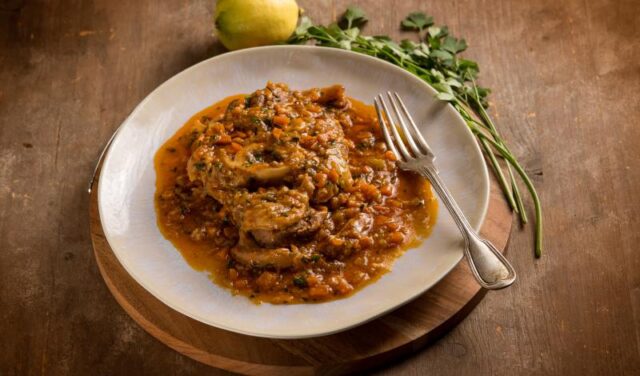 Versare un po’ d’olio in una pentola e lasciarlo scaldare. Adagiare sopra il pezzo di carne di vitello per farlo rosolare bene da ogni lato (vi occorreranno circa 10 minuti).